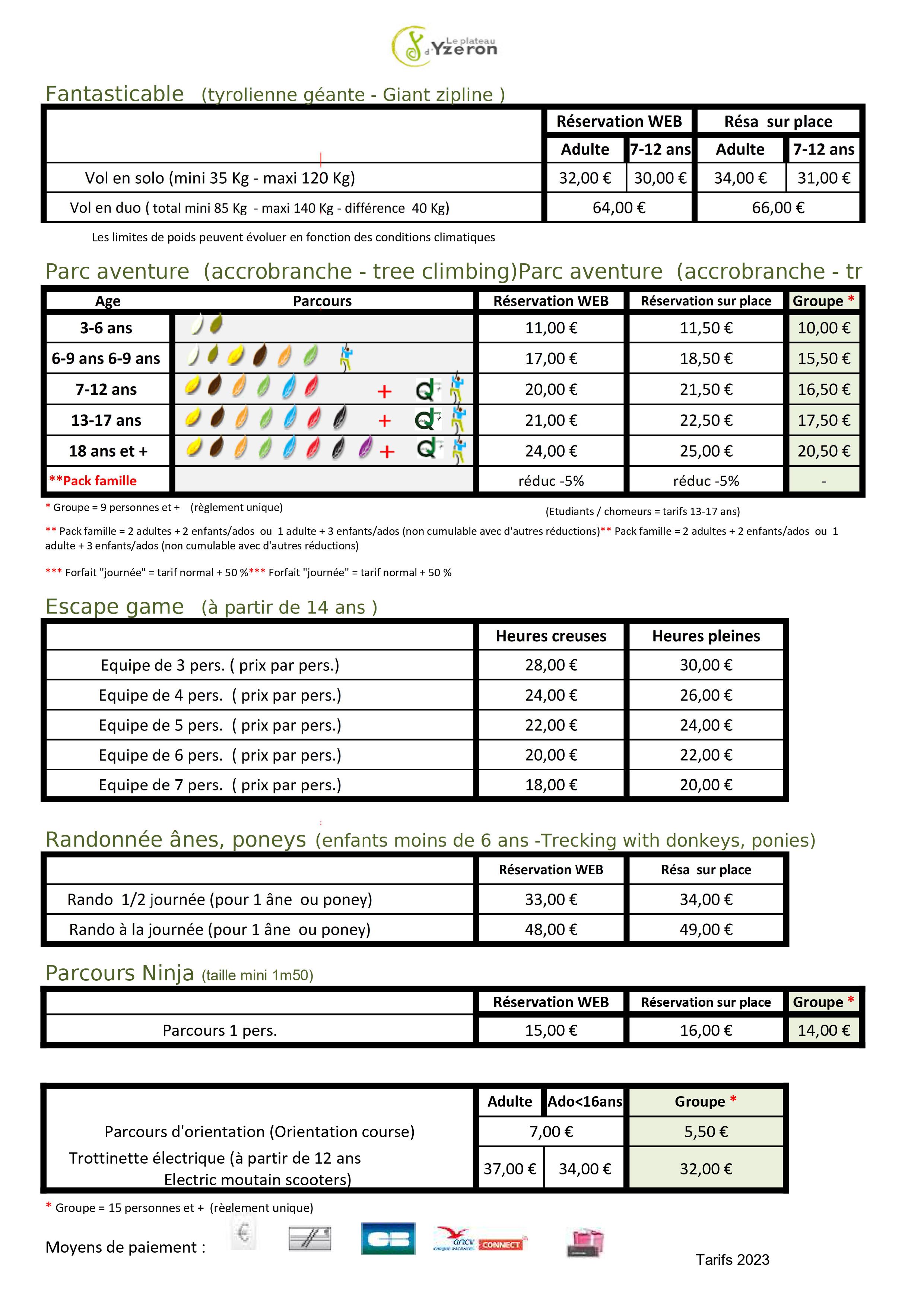 Tarifs activités de loisirs<- Cliquez pour agrandir l'image Ou téléchargez nos tarifs au format PDF. Vous pouvez également retrouver tous les tarifs par activité en vous rendant sur les fiches activités. Ils sont aussi indiqués lorsque vous faîtes une réservation. |